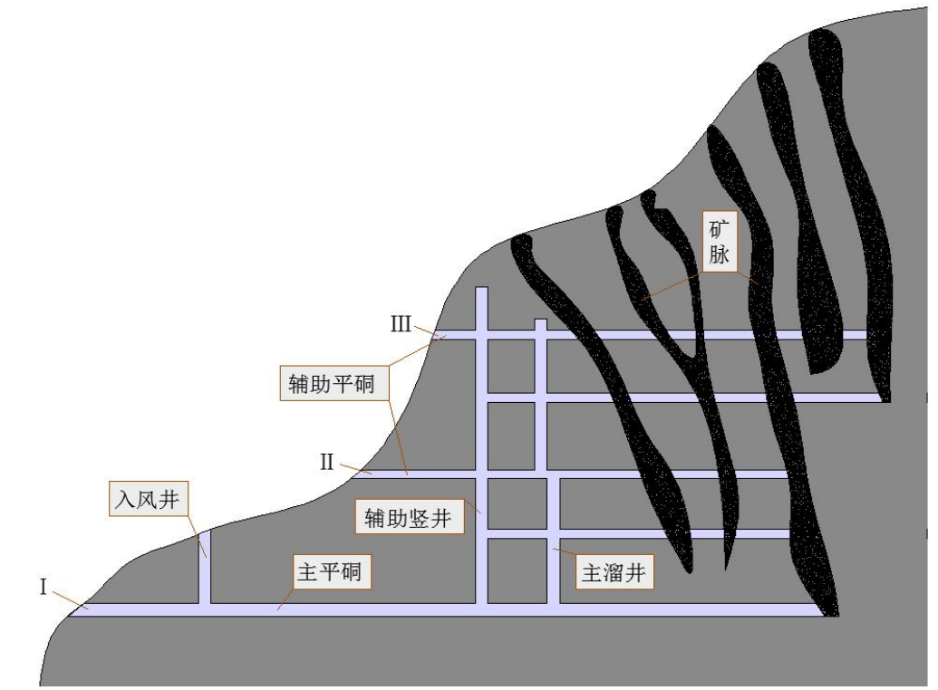 当矿脉与山坡的倾斜方向一致,且上盘地层稳固,同时具备适宜的工业场地布置条件时,垂直矿体走向上盘平硐开拓法便成为了一种可行的方案。在这种开拓方式中,平硐从矿体的上盘切入,穿过矿脉后,沿着矿体的走向布置阶段平硐。为了确保井下作业的安全与高效,还需要配置独立的通风系统,以保证井下空气的新鲜和流通,同时设置废石溜井,用于及时排出开采过程中产生的废石。